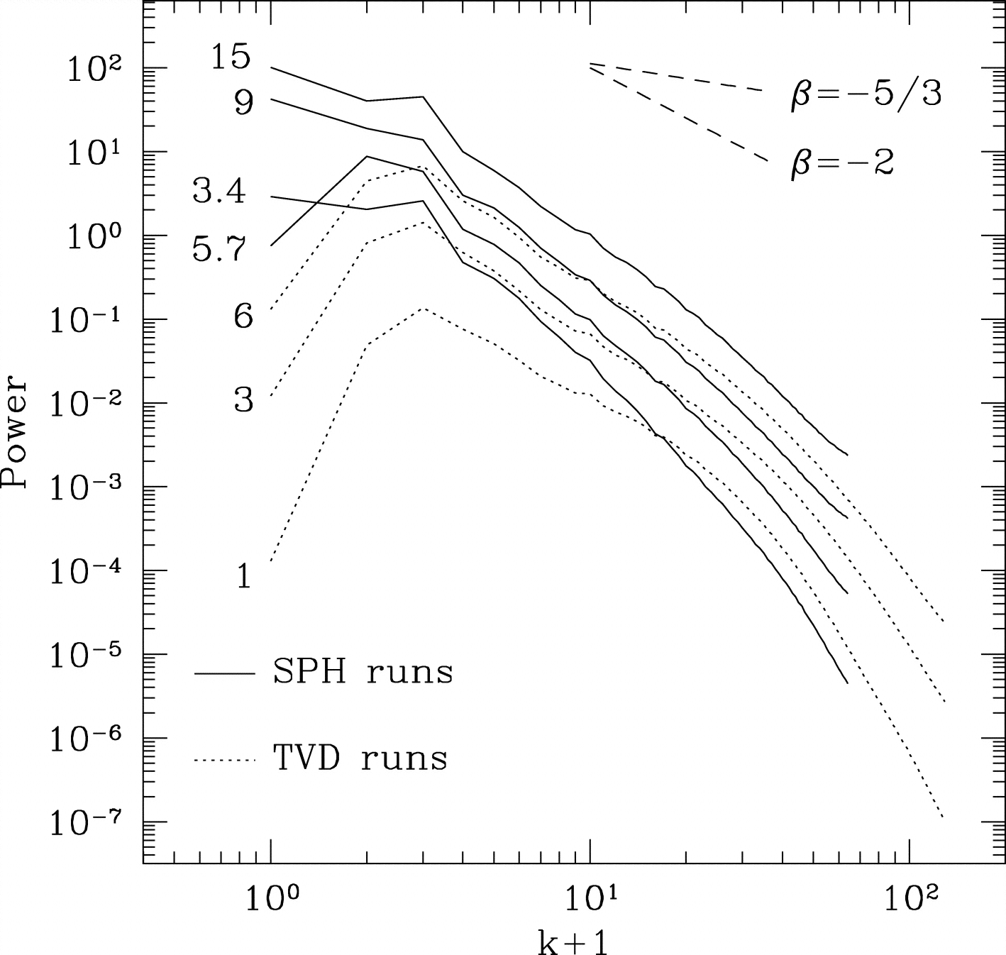 Energy spectrum for each simulation. The solid lines correspond to SPH simulations and the dotted lines to TVD simulations. The dashed lines have a slope of −2 and ﹩-5/ 3﹩.