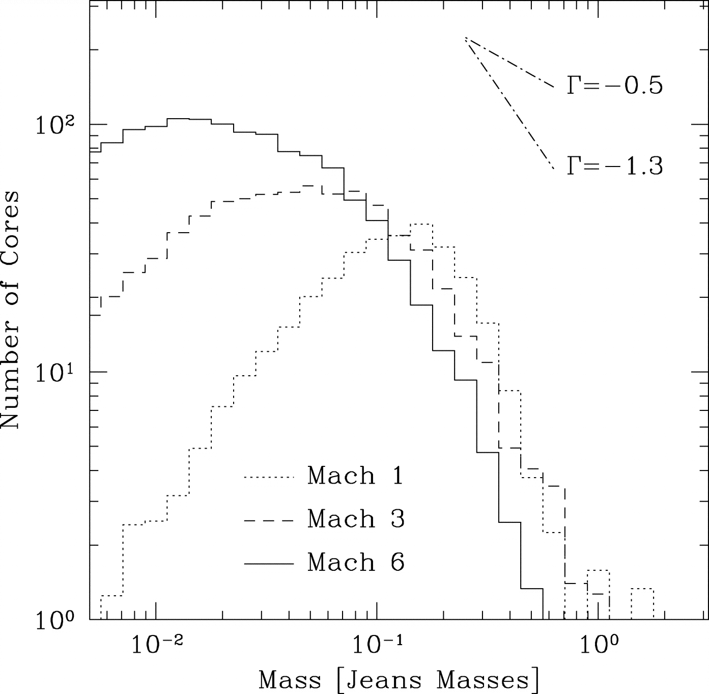 Time‐averaged core mass distribution resulting from TVD simulations. The two dot‐dashed lines with slopes of −0.5 and −1.3 are shown for comparison with the mass functions of giant molecular clouds and protostellar cores, respectively.