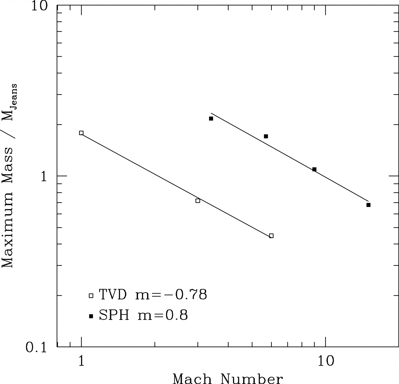 (a) Mass of the most massive core, and (b) mass at which the maximum of the histogram occurs as a function of Ms. Filled (open) squares denote results from SPH (TVD) runs. Solid lines represent least‐squares fits to the data, and m represents the slope of the fit. Note that, for each numeric scheme, the mass decreases as the Ms number increases.