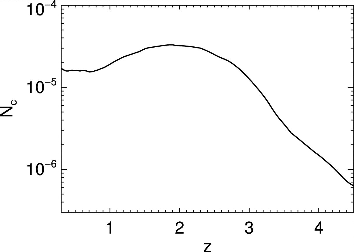 Expected mean number of companions per quasar with proper transverse separation ﹩5\ h^{-1}\ \mathrm{kpc}\,< R_{\mathrm{prop}\,}< 50\ h^{-1}\ \mathrm{kpc}\,﹩ and velocity difference ﹩\vert \Delta v\vert < 2000\ \mathrm{km}\,\ \mathrm{s}\,^{-1}﹩, as a function of redshift calculated from eq. [16], which assumes that the large‐scale quasar correlation function can be extrapolated as a power law to small scales. We used the correlation function parameters ﹩\gamma =1.53﹩ and ﹩r_{0}=4.8\ h^{-1}\ \mathrm{Mpc}\,﹩ measured by PMN04 from the 2dF quasar survey. A perfect survey, with no sources of incompleteness, is assumed. In a sample of ~50,000 quasars, the predicted number of binaries with ﹩5\ h^{-1}\ \mathrm{kpc}\,< R< 50\ h^{-1}\ \mathrm{kpc}\,﹩ is ~1. However, our clustering sample already contains 20 quasars with transverse separations this small, which is compelling evidence for excess clustering over what is expected from extrapolating the correlation function.