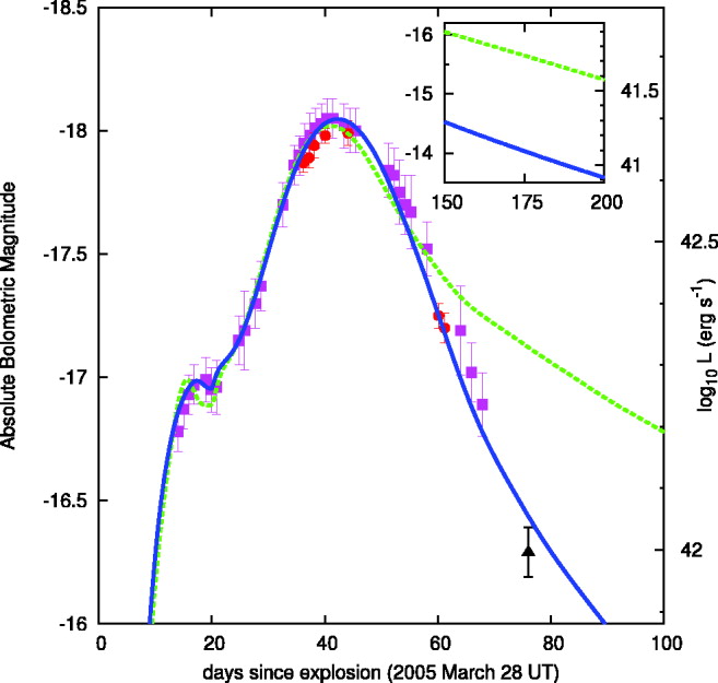 Bolometric light curve constructed from FLWO (filled squares; M. Modjaz et al. 2005, in preparation), HCT (filled circles; Anupama et al. 2005), and MAGNUM (filled triangle; N. Inada et al. 2005, in preparation) photometry. The contribution of near‐IR light is between ~20% of the total at early phases and ~50% at late phases. Synthetic light curves are shown for normal (dashed line) and reduced (solid line) γ‐ray opacities (see text). The inset shows the predicted LCs of each model when SN 2005bf emerges from behind the Sun in fall 2005. See § 2 for details.