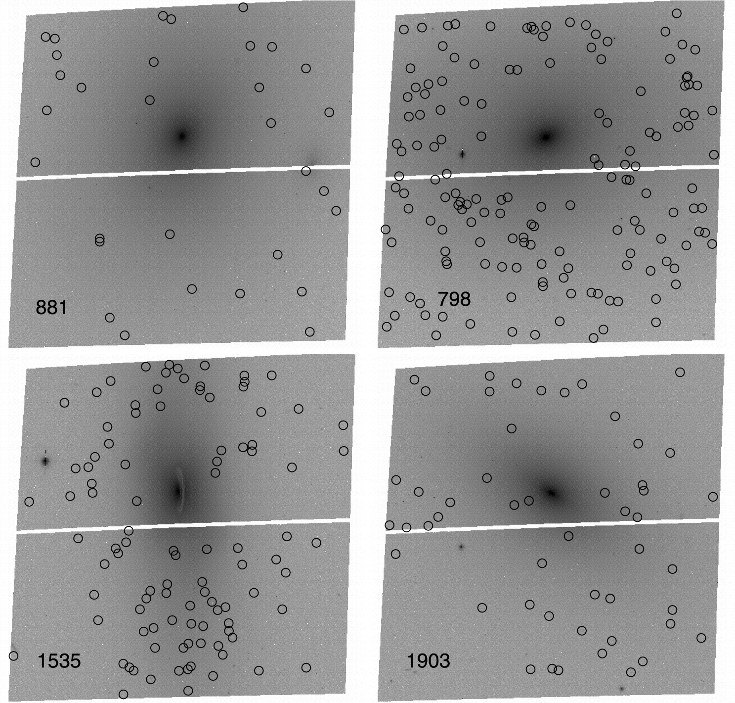 Spatial distribution of red (﹩g-z> 1.0﹩), diffuse cluster candidates around galaxies with significant excesses. While some of the objects are in the background, the large majority are likely star clusters. For obviously inclined or elliptical galaxies, it is possible to see that the spatial distribution of the clusters appears to follow the underlying galaxy light. The VCC numbers of the galaxies are shown in the lower left.