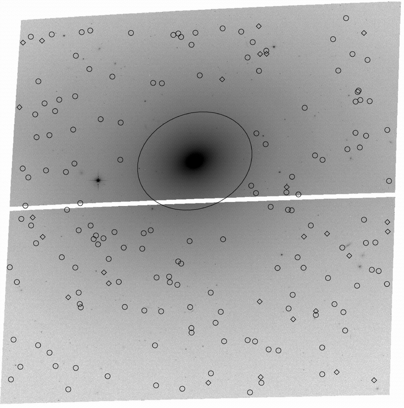 F850LP (z) image of VCC 798 with diffuse objects and a ﹩\mu _{z,\mathrm{galaxy}\,}=19﹩ mag arcsec−2 isophote overplotted. Inside this ellipse, we do not find any diffuse clusters, but this is likely because our detection efficiency is rapidly becoming low, and not necessarily because of any intrinsic deficit of clusters toward the galaxy center.