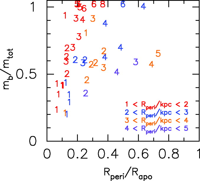 Distribution of mb/mtot against Rperi/Rapo in the galactic halo at ﹩z=2.0﹩. Red, blue, orange, and purple numbers indicate different ranges of the pericentric distance from ﹩1< R_{\mathrm{peri}\,}/ \mathrm{kpc}\,< 2﹩ to ﹩4< R_{\mathrm{peri}\,}/ \mathrm{kpc}\,< 5﹩, and the numbers indicate how many times each clump passes the pericenter. We obtain pericenters and apocenters from the most recent period of the clumps. Note that we do not consider clumps that have never passed pericenters or larger pericentric distances ﹩R_{\mathrm{peri}\,}> 5﹩ kpc in this plot.