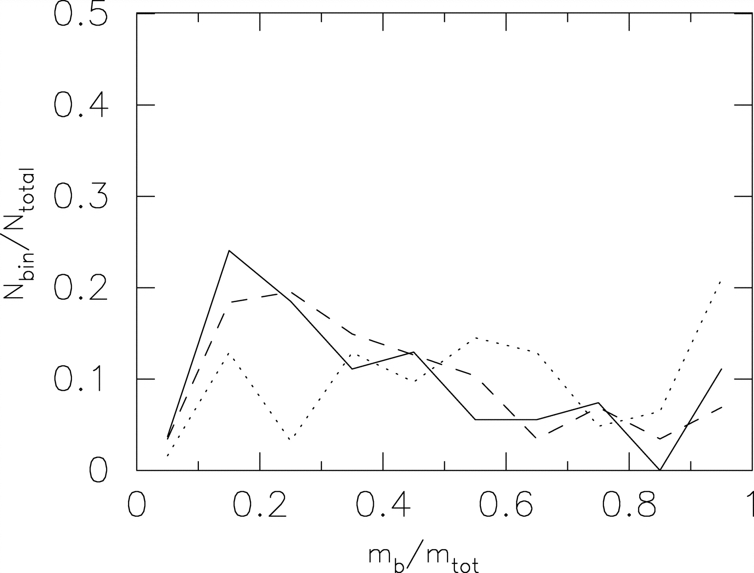 Fraction of clumps with mb/mtot at three redshifts, i.e., ﹩z=4.7﹩ (solid line), ﹩z=3.3﹩ (dashed line), and ﹩z=2.0﹩ (dotted line).