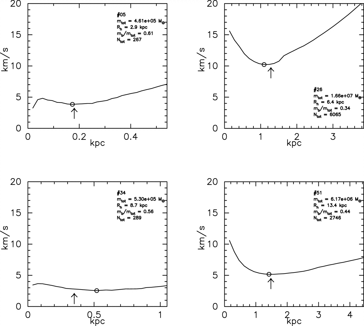 Circular velocity profiles of four randomly selected clumps at ﹩z=2.0﹩. The circular velocities are estimated by ﹩[ GM( < r) / r] ^{1/2}﹩, where r is the distance from the center of the clump and ﹩M( < r) ﹩ is the mass within r. We plot from 0 to 3rsub for r. The upward‐pointing arrows indicate the positions of the rsub values, and the open circles represent the minimum points of the circular profiles.