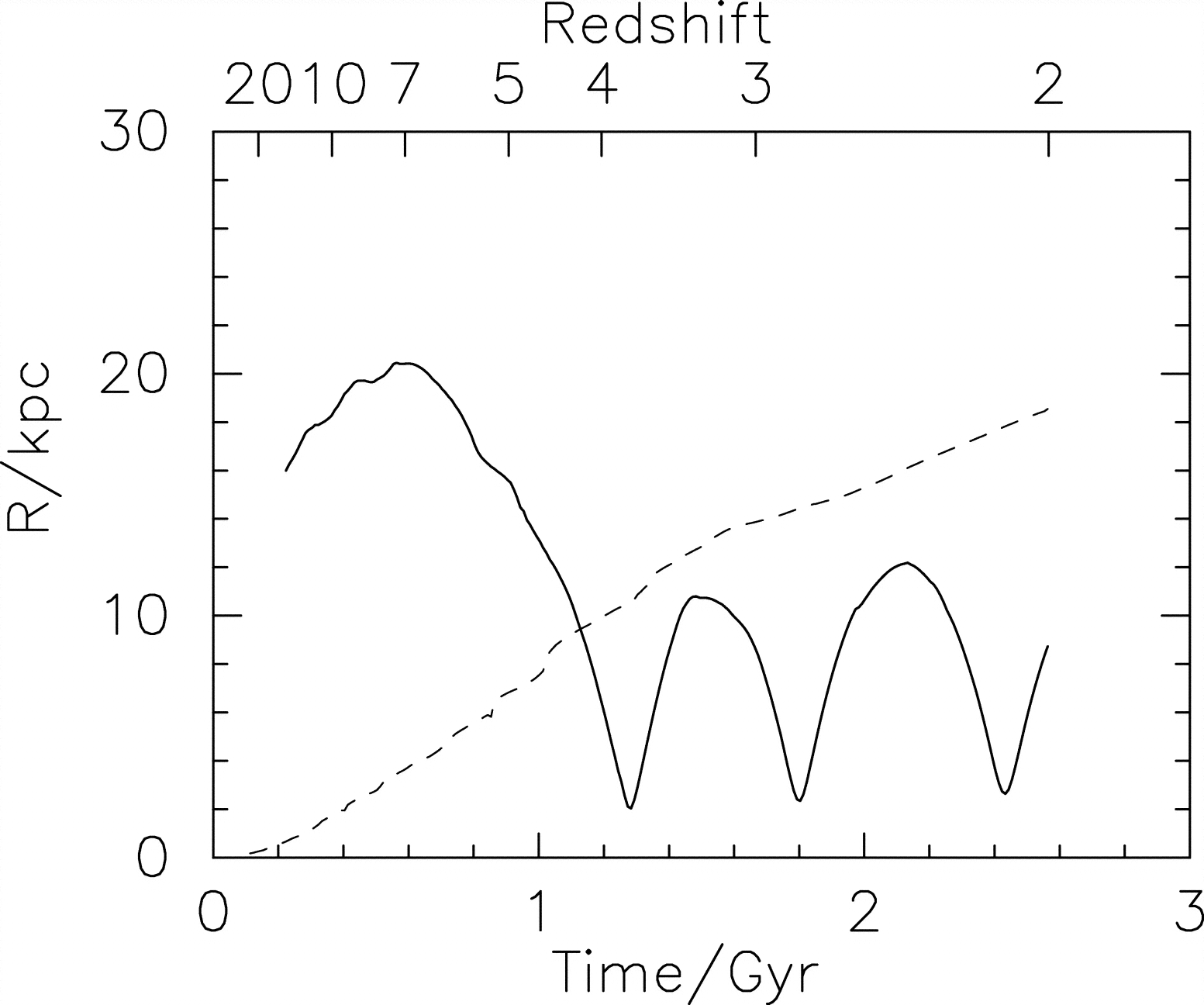 Distance of the reference clump from the galactic center Rh and the virial radius of the host galaxy Rvir against time or redshift. Solid and dashed lines indicate Rh and Rvir, respectively.
