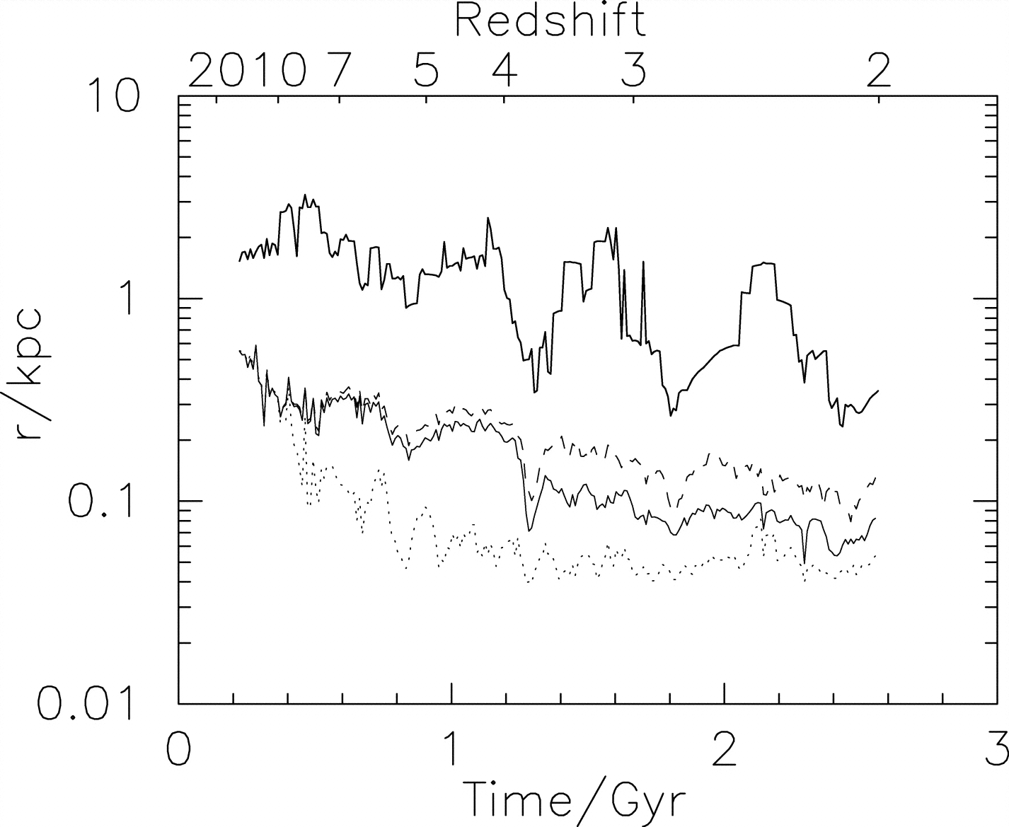 Time evolution of the half‐mass radii of the total, baryon, and dark matter components of the reference clump. Thin solid, dotted, and dashed lines indicate rhlf,tot, rhlf,b, and rhlf,dm, respectively. The thick solid line indicates rsub, which is already shown in Fig. 7.