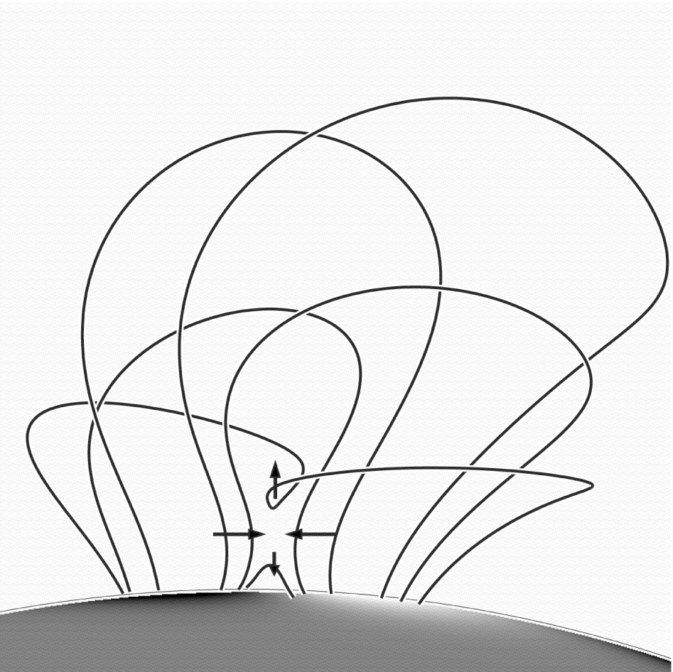 Examples of the field lines, which reconnect below the flux rope. The bold arrows denote the forces acting on the field lines. The pinching of the field lines is the result of the magnetic pressure force and pushes in and reconnects the field lines. The reconnected field lines then form arcades below the quasi separatrix layer or dipped field lines above, which then push the flux rope outward.