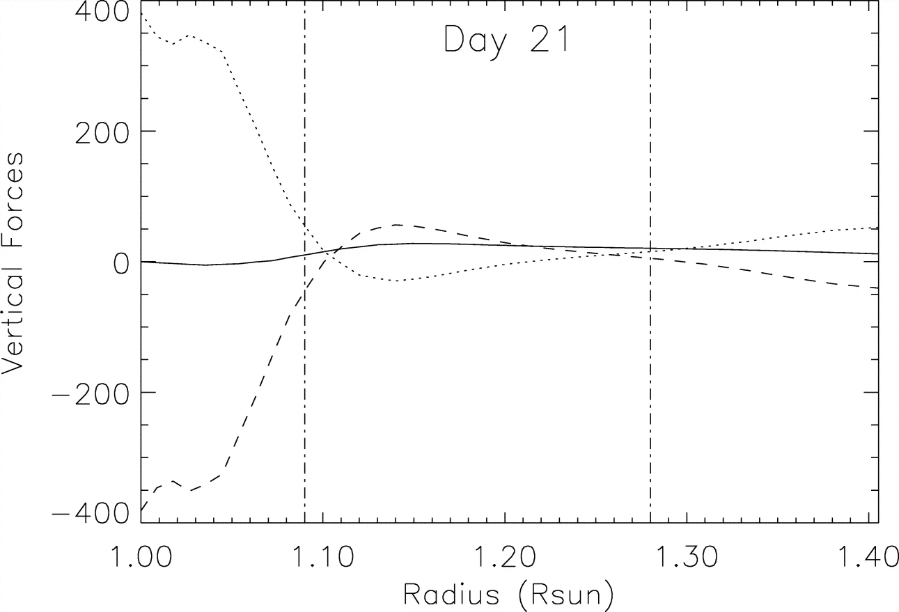 The r‐component of the Lorentz force (solid line), pressure force (dotted line), and tension force (dashed line) vs. radial height at a longitude of ﹩\phi =41^{\circ }﹩ at the midpoint of the trailing bipole on day 21. The vertical dash‐dotted lines denote the radial height of the QSL (﹩r=1.09﹩ R⊙) and the axis of the flux rope (﹩r=1.28﹩ R⊙)