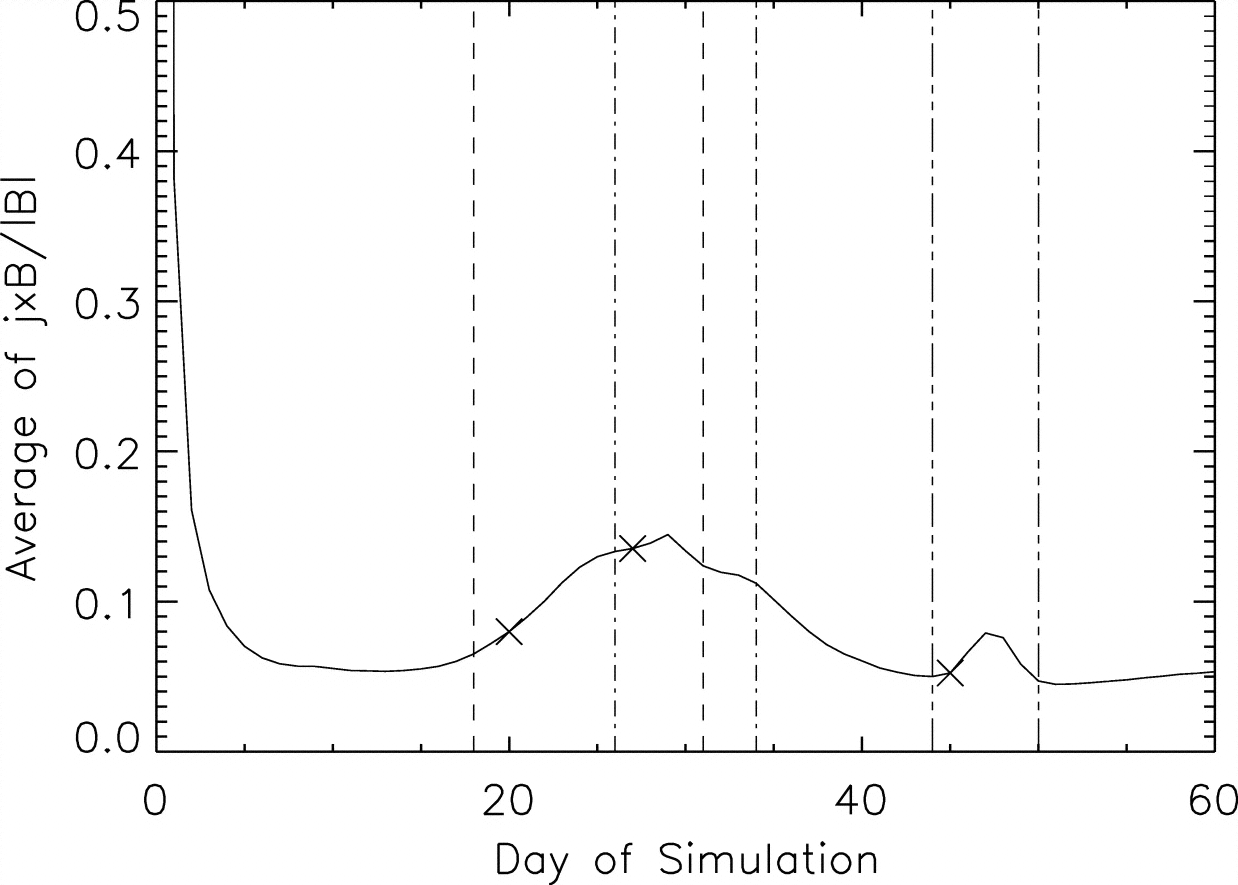 Average values of ﹩\boldsymbol{j}\boldsymbol{\times} \boldsymbol{B}/ \mid B\mid ﹩ vs. day of simulation, where the average is calculated over all the grid points in the computational box. The vertical lines denote the start/end times when the flux ropes start to lift off, the dashed lines denote the trailing bipole, the dash‐dotted lines denote the lead bipole, and the dash‐dot‐dot‐dotted lines denote the external PIL. The crosses denote the time at which field lines may be seen reconnecting at a QSL below the flux rope as it rises.