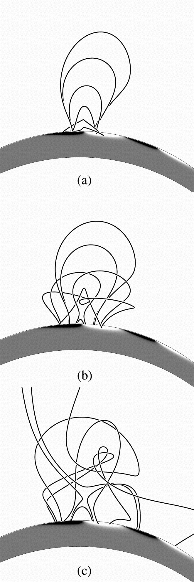 Example of the liftoff of the flux rope lying above the internal PIL of the trailing bipole on (a) day 17, (b) day 22, and (c) day 25. In (b, c) the formation of a quasi separatrix layer occurs below the flux rope in the form of an X‐line when viewed in two dimensions. This quasi separatrix layer is seen to rise as the flux rope rises.