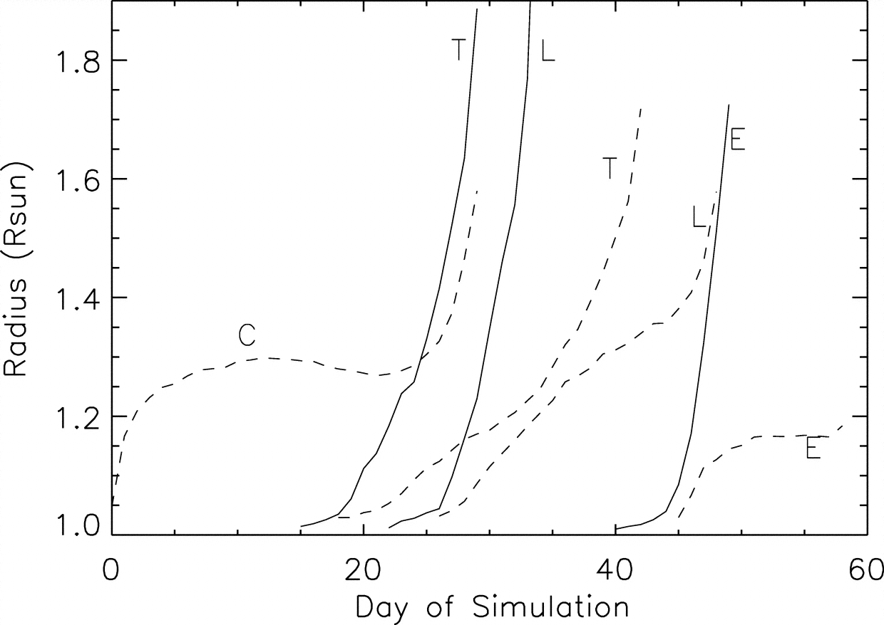 Evolution of the quasi separatrix layers and flux ropes through the corona, where their radial height is shown as a function of the day of simulations taken in a cut through the center of the bipoles. The solid lines represent the flux ropes and the dashed lines, the quasi separatrix layers or quasi separators. The labeling is as follows: "T" marks the trailing bipole, "L" marks the lead bipole, "E" marks the external PIL, and "C" marks the initial coronal quasi separator.