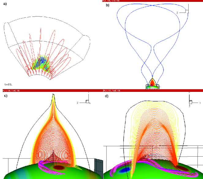 (a) The original flux rope when emergence is stopped at t = 86. This figure is also available as an mpeg animation. (b–d) Three views of the eruption end state at t = 106: two flux ropes separated by cusped loops. The lower boundary shows radial magnetic field strength (red, positive; blue, negative). We refer to the lower boundary of the original flux rope as the rope bipole (red and blue circular poles), and that of the originally potential arcade as the arcade boundary (horizontal red and blue bands). The pink field lines rooted in the rope bipole represent the lower, surviving rope and show the bald‐patch separatrix surface (BPSS). The red field lines rooted in the rope bipole are dipped field lines within the lower, surviving rope that intersect the X = 0, Z = 0 vertical axis. The orange and yellow lines are nondipped but non‐escaping field lines that intersect the vertical axis just above the red dipped lines. The black line is a non‐escaping field line rooted in the arcade boundary, and the purple field line in (b) represents the upper, escaping flux rope rooted in the arcade boundary. The red, orange, yellow, black, and purple lines intersect the vertical axis at evenly spaced intervals.