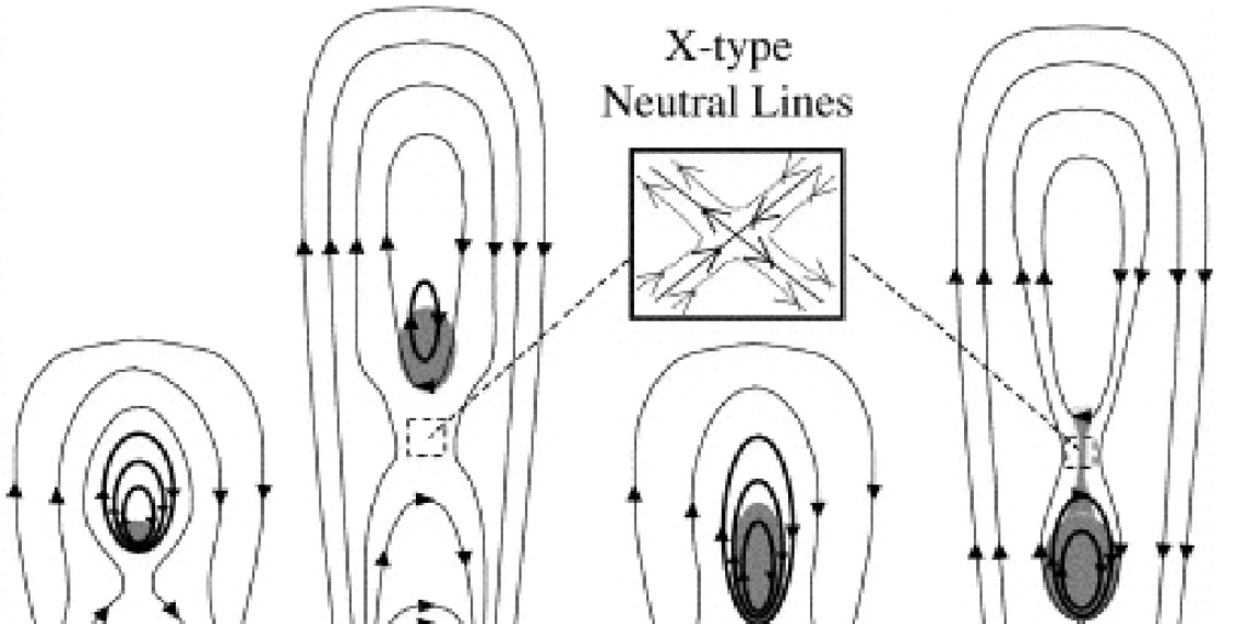 Two‐dimensional illustrations of erupting flux ropes. Left two images: The case in which reconnection occurs at an X‐point below the rope, resulting in the total expulsion of the flux rope. Right two images: The case in which the rope grazes the photosphere and reconnection occurs internally, resulting in a partial expulsion of the flux rope (and possibly of the filament entrained in the rope's dips, represented here with gray shading). Adapted from Gilbert et al. (2001).
