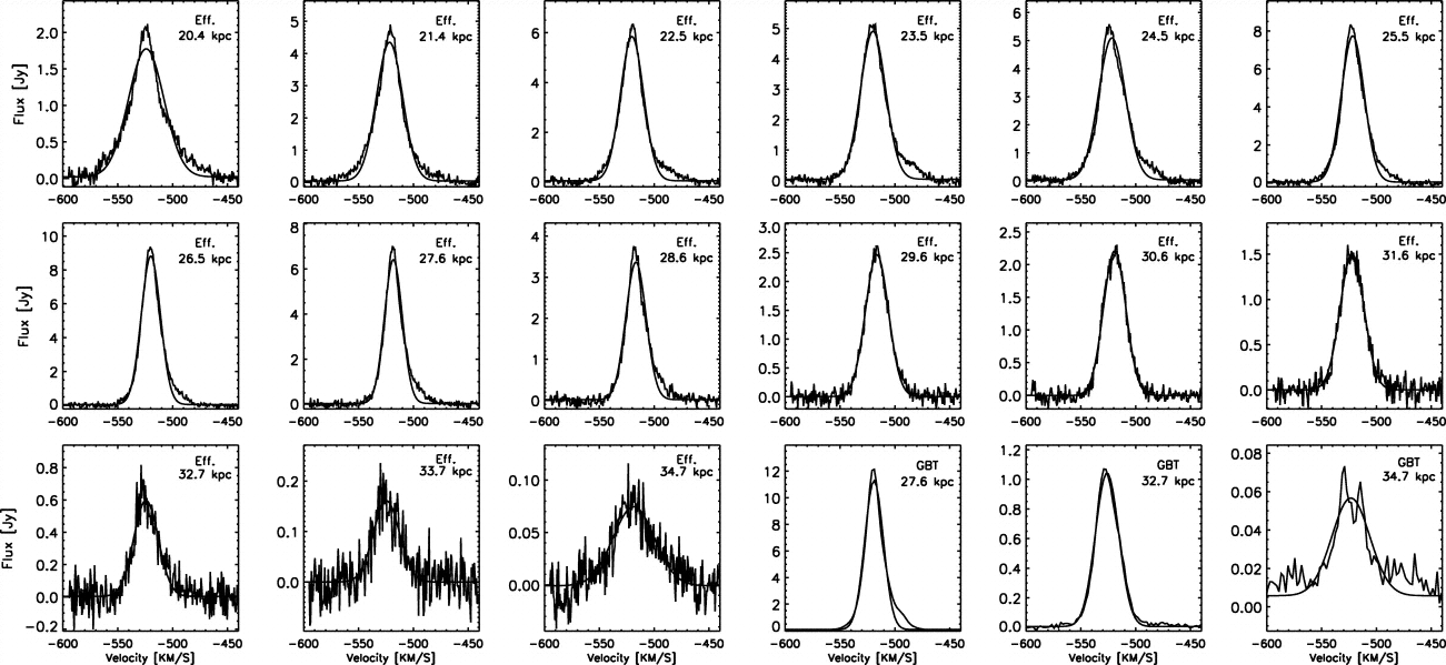 H I spectra—baseline‐subtracted—from the Effelsberg and GBT 100 m radio telescopes, with their Gaussian fits. The radius is given in the top right corner. These are only the central portions of the observed spectra; we believe that all the emission shown here, including the line wings, is real (cf. the Effelsberg and GBT profiles at 27.6 kpc).