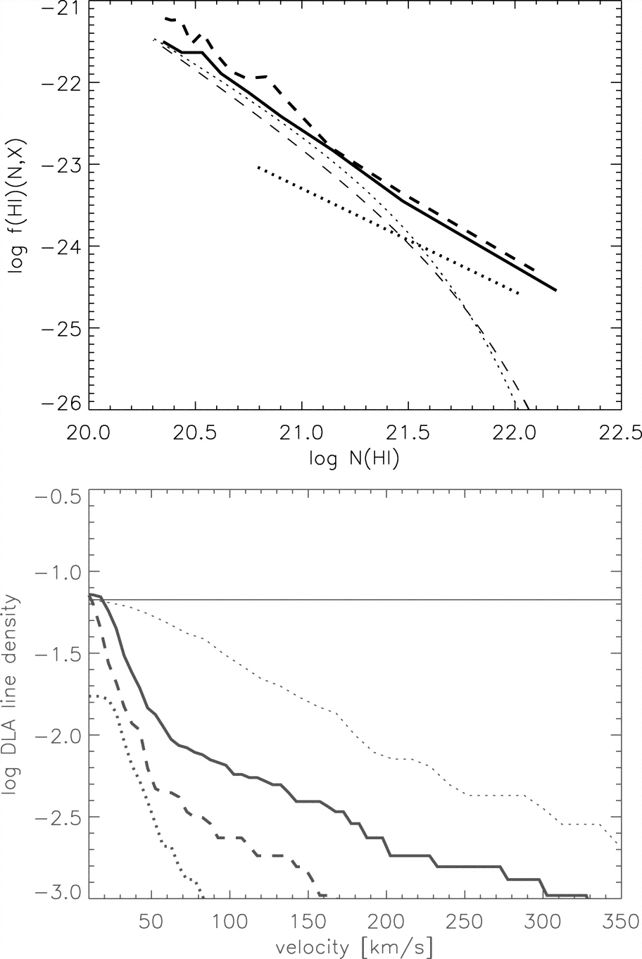 Same as Fig. 9, but for a run with full radiative transfer (C2; thick solid line), a run with self‐shielding above the physical density 10−2 cm−3 (C2s; thick dashed line), and a run with the optically thin approximation throughout the entire simulation volume (C2t; thick dotted line), all at ﹩z=3﹩.