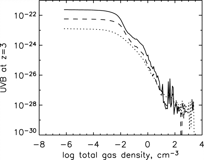 Mean specific intensity (ergs s−1 cm−2 Hz−1 sr−1) vs. gas number density in model C1 at ﹩z=3﹩ at photon energies 13.6 eV (solid line), 24.6 eV (dashed line), and 54.4 eV (dotted line).