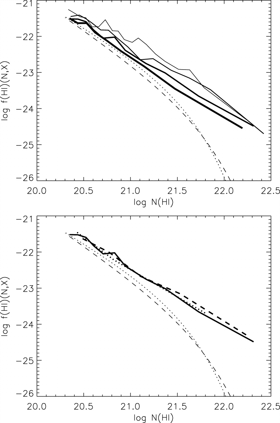 Top: Upper four solid lines show the H I column density frequency distribution ﹩f( N,X) ﹩ for runs C−1, C0, C1, and C2 (from thinnest to thickest line), all at ﹩z=3﹩. The lower two lines are the Γ function fits to the SDSS DLA survey data from Prochaska et al. (2005) for ﹩z=2.5{\mbox{--}} 3.0﹩ (dashed line) and ﹩z=3.0{\mbox{--}} 3.5﹩ (dotted line). Bottom: Same as top, except that the upper three lines give ﹩f( N,X) ﹩ for runs C1 (solid line), B1 (dashed line), and A1 (dotted line).