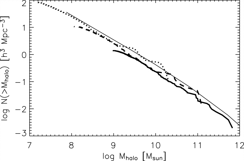 Cumulative halo mass function at ﹩z=3﹩ for dark matter only, for runs C1 (thick solid line), B1 (thick dashed line), and A1 (thick dotted line). The thin solid line is the analytical mass function from Mo & White (2002).