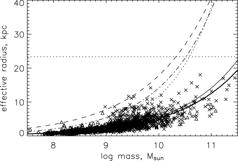 Effective radius vs. halo mass, for all DLAs with identified host halos in runs A1 (diamonds), B1 (triangles), and C2 (crosses) at ﹩z=3﹩, for the fiducial background in Fig. 2. This figure does not account for DLAs caused by intergalactic H I clouds for which no host halo in the same base grid cell was found. The dotted horizontal line shows the size of the base grid cell in the ﹩8\ h^{-1}\ \mathrm{Mpc}\,﹩ volume. The solid lines are our least‐squares fits with eq. (8) for all halos from runs A1, B1, and C2 (thick line) and all halos from runs A1, B1, and C1 (thin line). For comparison, we have also plotted the fits to DLA radii from Nagamine et al. (2004), for models O3 (no wind, 10 Mpc volume; dashed line), Q3 (strong wind, 10 Mpc volume, low resolution; dashed‐dotted line), and Q5 (strong wind, 10 Mpc volume, high resolution; dotted line).