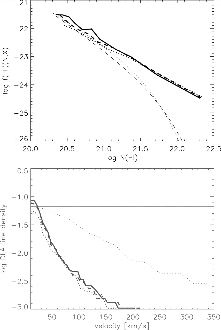 Results for a run with the full quasar background from Fig. 2 (C1; thick solid line) and runs with 2 times (C1b; thick dashed line) and 4 times (C1c; thick dotted line) the fiducial quasar background, all at ﹩z=3﹩. Top: H I column density frequency distribution ﹩f( N,X) ﹩. The two thin lines are the SDSS DLA survey data as in Fig. 4. Bottom: Line density ﹩l_{\mathrm{DLA}\,}( X) ﹩ of DLAs with the Si II velocity width higher than ﹩v_{\mathrm{Si}\,\,{}^{{\rm{\small II}}}}﹩ vs. ﹩v_{\mathrm{Si}\,\,{}^{{\rm{\small II}}}}﹩. The thin dotted and thin horizontal lines show the observed kinematic distribution as in Fig. 5.
