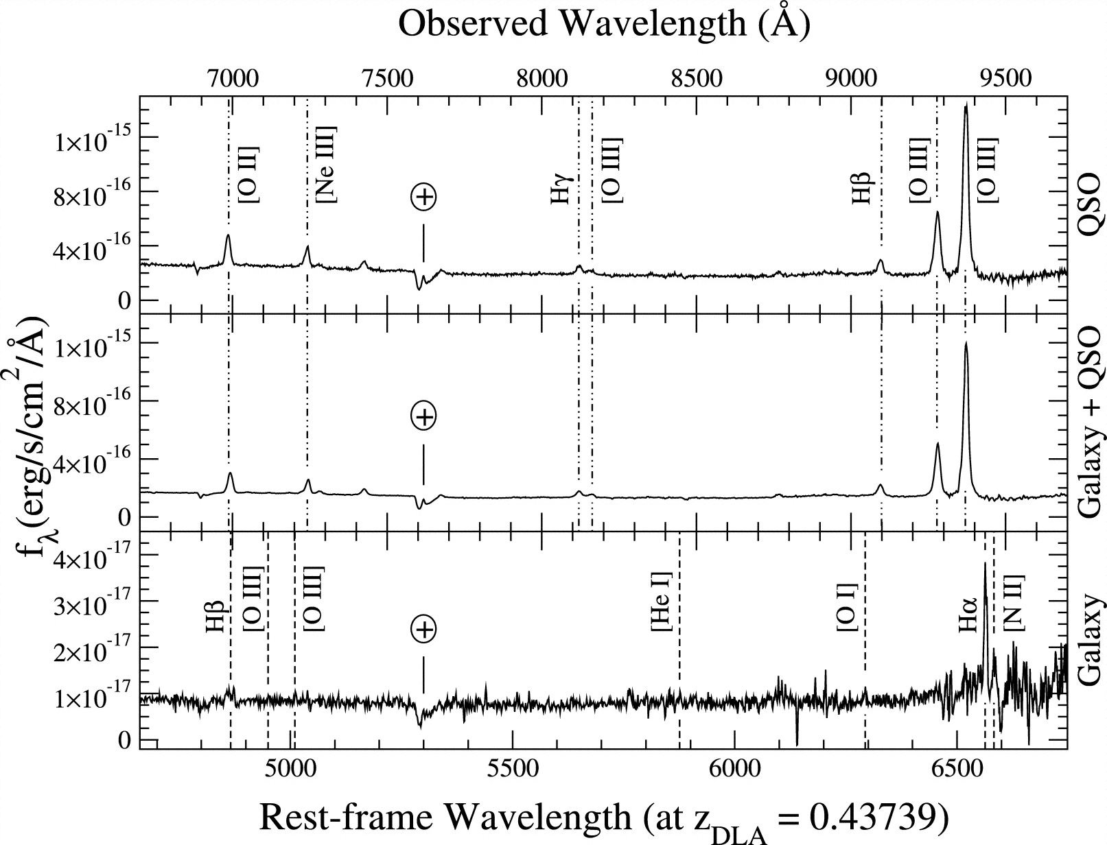 Extracted spectra of the QSO 3C 196 and its DLA galaxy in the red channel of LRIS, which covers a rest‐frame wavelength range from 4700 to 6700 Å. The panels show spectra of the QSO, the galaxy plus the QSO, and the galaxy after subtracting the QSO contribution. The prominent emission‐line and absorption‐line features of the galaxy are shown with dashed lines, and emissions of the QSO with dash‐dotted lines. The broad feature near 7600 Å is caused by telluric absorption. Note that Hβ emission from the DLA galaxy is slightly offset from the [O II] emission of the QSO.