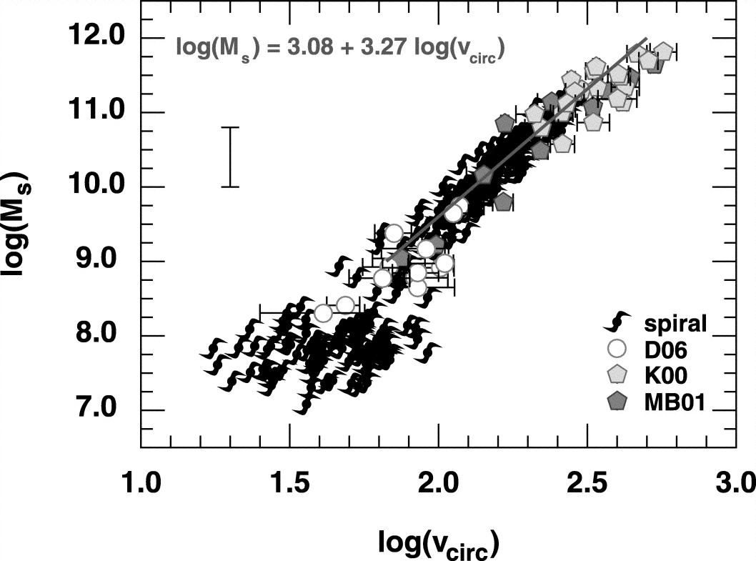 Left: Stellar mass Tully‐Fisher relation. Symbols same as in Fig. 1 (with spiral = TP00+M05+G06). Right: H I gas+stellar mass Tully‐Fisher relation. For the late types, only M05 and G06 give all the necessary ingredients to derive ﹩M_{g+s}﹩, so spiral = M05+G06 here.