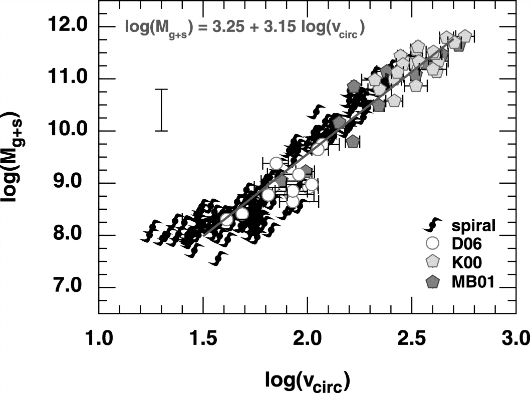 Left: Stellar mass Tully‐Fisher relation. Symbols same as in Fig. 1 (with spiral = TP00+M05+G06). Right: H I gas+stellar mass Tully‐Fisher relation. For the late types, only M05 and G06 give all the necessary ingredients to derive ﹩M_{g+s}﹩, so spiral = M05+G06 here.