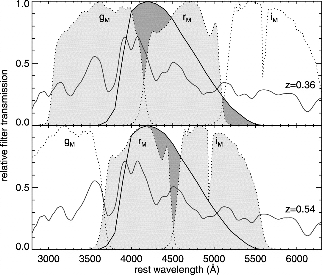Location of the observed filters at redshifts ﹩z=0.36﹩ (top) and ﹩z=0.54﹩ (bottom). We consider the same example of ﹩K﹩‐correction as in Fig. 9. The solid curves represent the rest‐frame ﹩B﹩ band, while the dotted curves represent the observed ﹩g_{\mathrm{M}\,}﹩, ﹩r_{\mathrm{M}\,}﹩, and ﹩i_{\mathrm{M}\,}﹩ bands. At redshifts where the observed and rest‐frame filter bands are misaligned, the observed color that straddles the rest‐frame filter band (highlighted for each plot) is the most important.