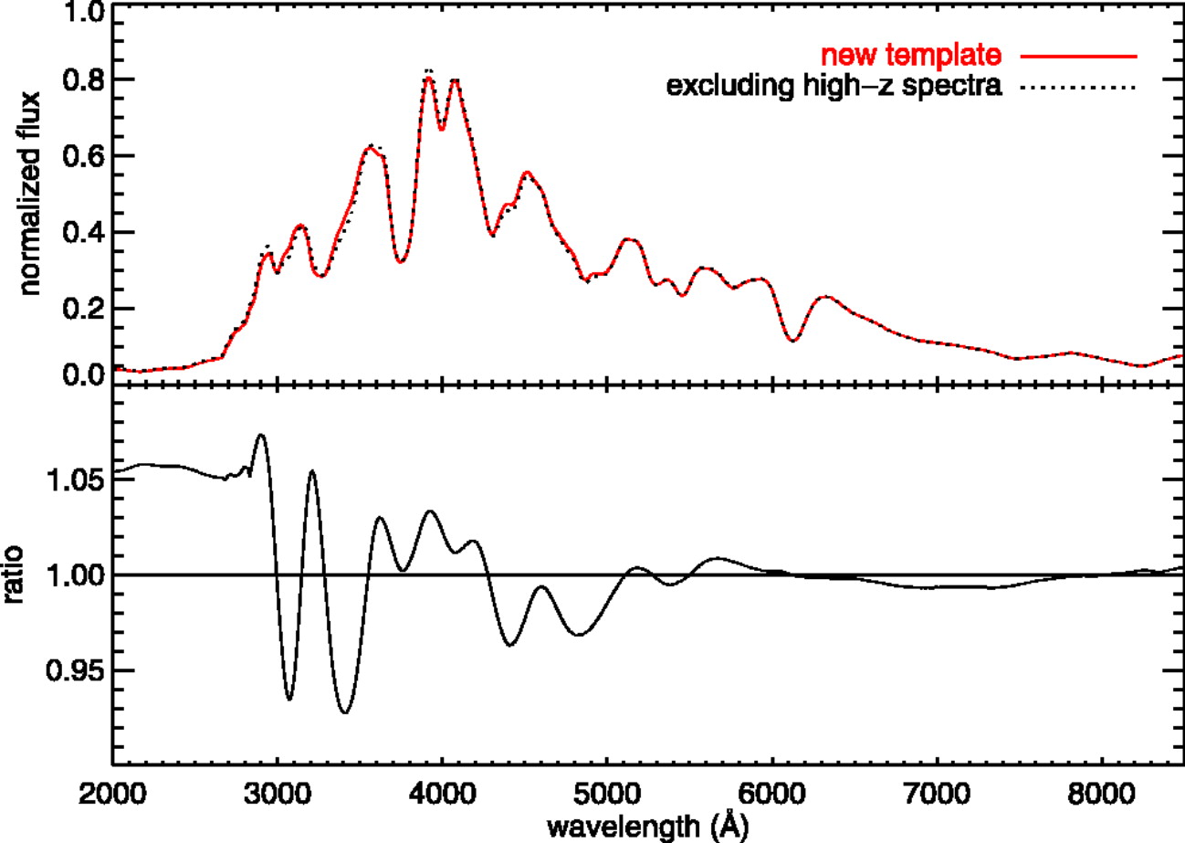Comparison between the spectral template built with the full sample of library spectra (solid curve) and the spectral template built with only low‐redshift spectra (dotted curve). The templates at maximum light are shown. The difference in ﹩K﹩‐corrections between the two spectral templates is small and mostly reflects the difference in the wavelength coverage of the two samples, rather than true evolution.