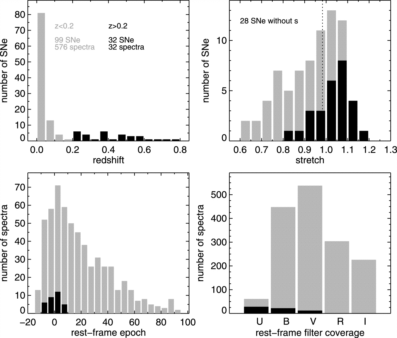 Characteristics of our current spectral library. The histograms are separated by redshift at ﹩z=0.2﹩ to demonstrate the difference in characteristics between the two samples (gray: ﹩z< 0.2﹩; black: ﹩z> 0.2﹩). The top left panel plots the histogram of the redshifts of the library supernovae. The top right panel plots the histogram of the stretch factors of the library supernovae. Only supernovae with reliable photometry are included in this plot. The median stretch value for the combined sample is marked with a dotted vertical line. The bottom left and right panels plot the histograms of the rest‐frame epoch relative to ﹩B﹩ band maximum light and the rest‐frame wavelength coverage of the library spectra, respectively.