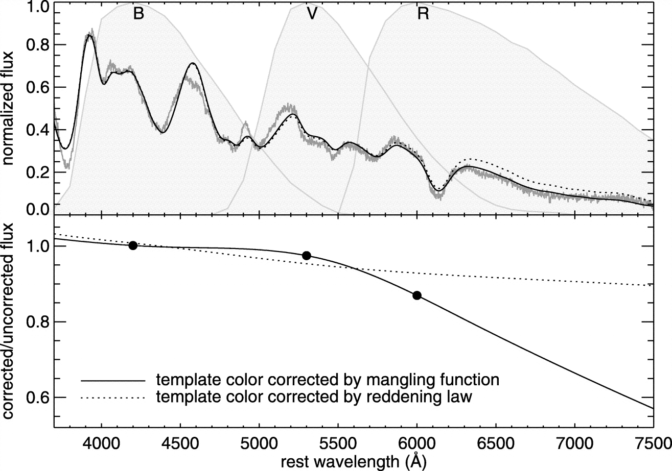 Example of color‐correction that contrasts the two color‐correction methods: reddening law slope correction and mangling function. The spectral template is color‐corrected to match the colors of an observed spectrum. The top panel shows three spectra: the observed spectrum (gray line), the spectral template corrected by the mangling function (black solid line), and the spectral template corrected by the reddening law (black dotted line). The bottom panel shows the color‐correction scale for the mangling function (black solid line) and for the reddening law (black dotted line). The black dots locate the spline knots for the mangling function. The mangling function adjusts the continuum using all the color information supplied, ﹩B-V﹩ and ﹩V-R﹩.