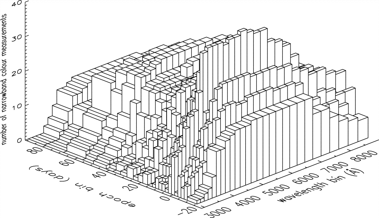 Schematic of the two‐dimensional grid defined by the epoch bins and the narrowband filters. The number of narrowband color measurements in each grid element is plotted in the third dimension.