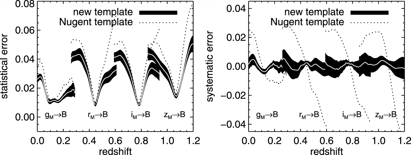K‐correction errors to the ﹩B﹩ band where the template spectrum is color‐corrected with rest‐frame colors. The errors of the new template and the revised template of N02 are represented with solid black and dotted curves, respectively. The statistical errors are plotted in the left panel, and the systematic errors in the right panel. The thickness of the black solid curve shows the dispersion from the random selection process and the thin white curve is the mean. The errors presented here are for individual observations on a light curve.