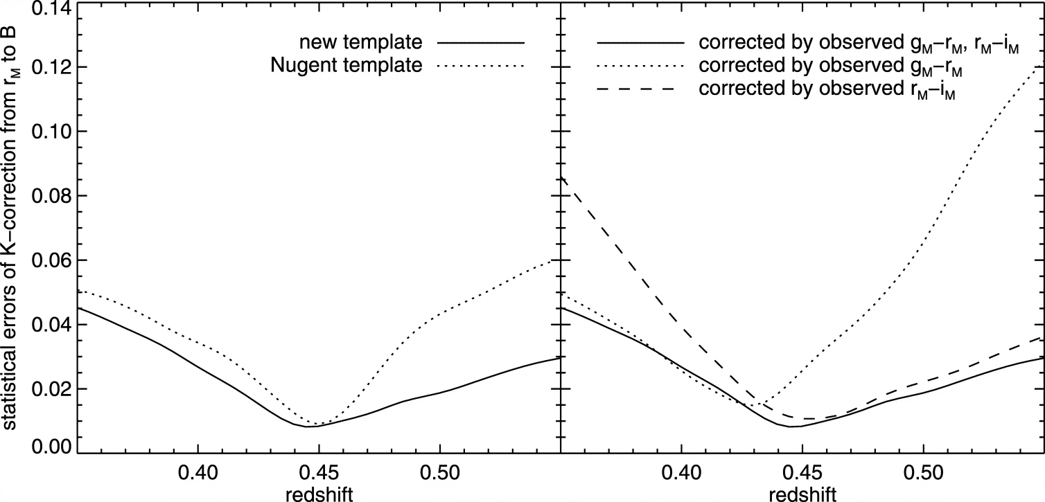 Statistical errors of ﹩K﹩‐correction from observed ﹩i_{\mathrm{M}\,}﹩ band to rest‐frame ﹩B﹩ band where the template spectrum is color‐corrected with "observed" colors. The observed colors are from the synthetic photometry using the observed filter bands ﹩g_{\mathrm{M}\,}﹩, ﹩r_{\mathrm{M}\,}﹩, and ﹩i_{\mathrm{M}\,}﹩. The left panel compares the errors of the revised template of N02 and the new template. Both templates are color‐corrected by observed ﹩g_{\mathrm{M}\,}-i_{\mathrm{M}\,}﹩ and ﹩i_{\mathrm{M}\,}-r_{\mathrm{M}\,}﹩ colors before the calculation. The right panel shows the effect of the availability of observed colors on the errors. The solid, dotted, and dashed curves represent the errors of the new template corrected by both ﹩g_{\mathrm{M}\,}-r_{\mathrm{M}\,}﹩ and ﹩r_{\mathrm{M}\,}-i_{\mathrm{M}\,}﹩ colors, ﹩g_{\mathrm{M}\,}-r_{\mathrm{M}\,}﹩ color alone, and ﹩r_{\mathrm{M}\,}-i_{\mathrm{M}\,}﹩ color alone, respectively.