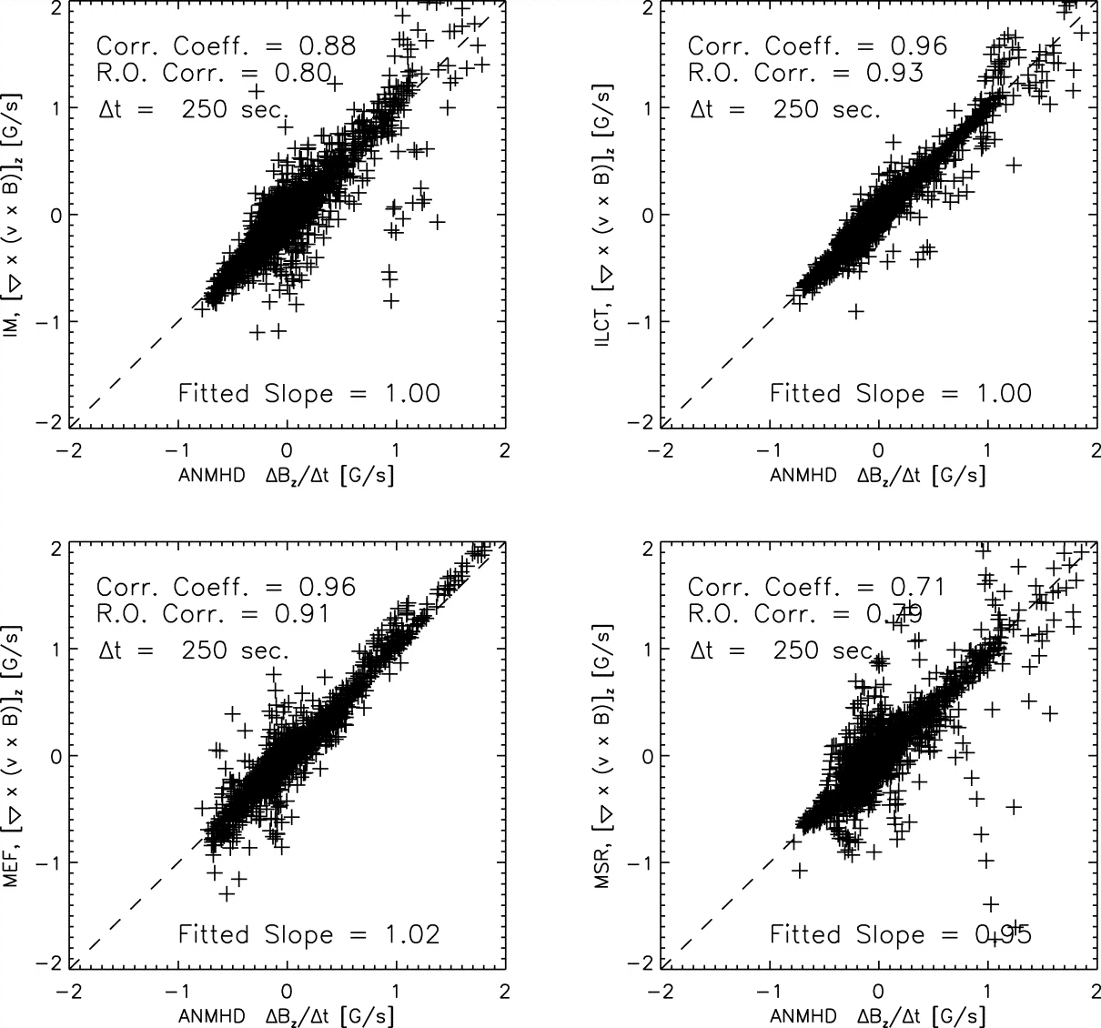 As with Fig. 9, but with the remaining methods’ (IM, ILCT, MSR, and MEF; clockwise from top left) estimates of ﹩[ {\boldsymbol{\nabla}} \boldsymbol{\times} ( \boldsymbol{v}_{\perp }\boldsymbol{\times} \boldsymbol{B}) ] {\boldsymbol{\cdot}} \hat{\boldsymbol{z}}﹩ vs. ﹩\Delta B_{z}/ \Delta t﹩.