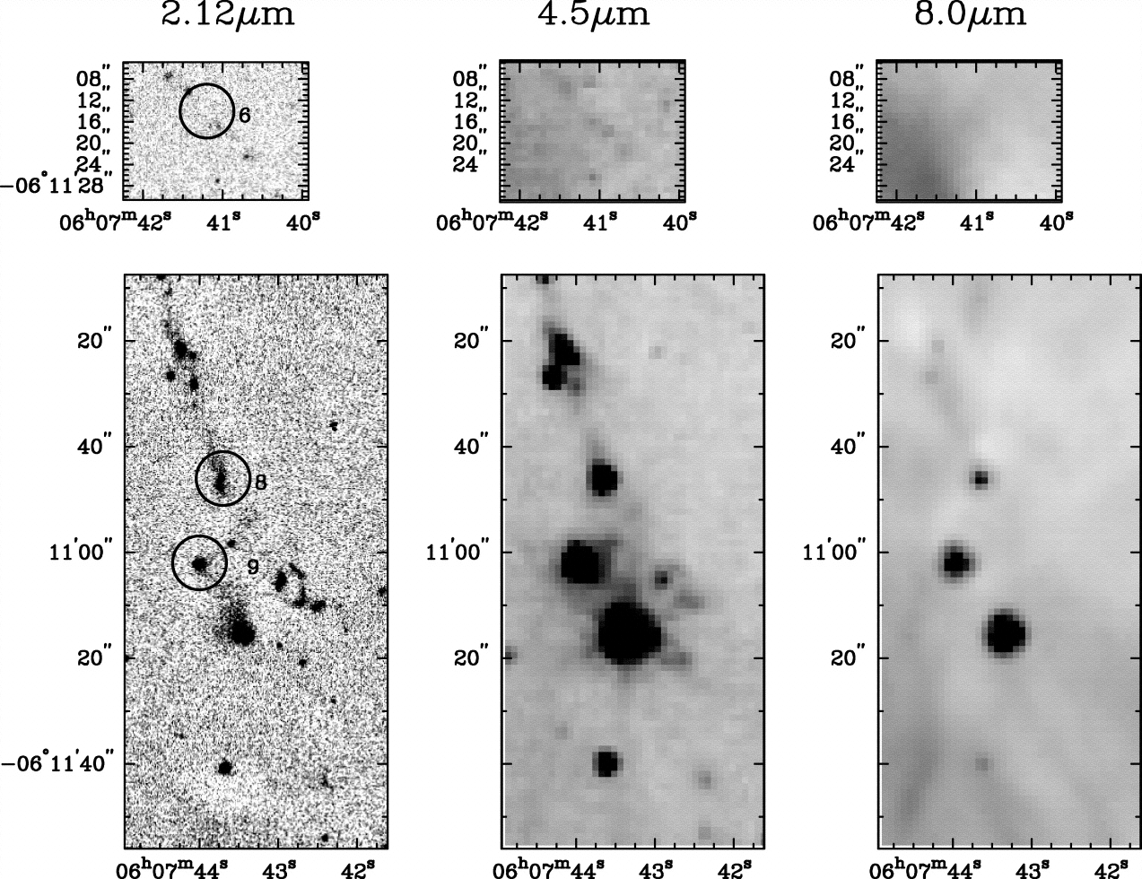 The S(1), 4.5 μm, and 8.0 μm images of three systems of H2 knots. Top row: HOD07 6 at 6h7m41.2s, −6°11﹩\arcmin﹩14﹩\arcsec﹩ is the center of symmetry of a string of emission knots. Bottom row: HOD07 8 at 6h7m43.7s, −6°10﹩\arcmin﹩46﹩\arcsec﹩ is the likely center of a single‐sided jet. HOD07 9 at 6h7m44.0s, −6°11﹩\arcmin﹩2﹩\arcsec﹩ is a star associated with H2 emission and the likely source of a bow shock.