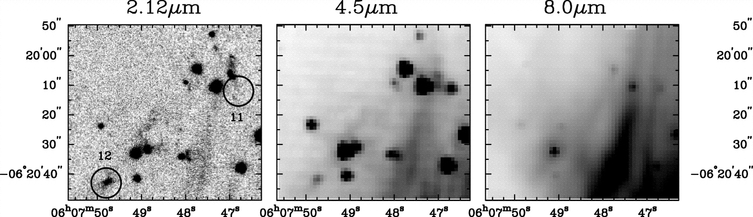 Images in 2.12 μm S(1), 4.5 μm, and 8.0 μm of the central region of the two outflow sources shown in Fig. 11: HOD07 11 at 6h7m46.8s, −6°20﹩\arcmin﹩12﹩\arcsec﹩ and HOD07 12 at 6h7m49.8s, −6°20﹩\arcmin﹩43﹩\arcsec﹩.