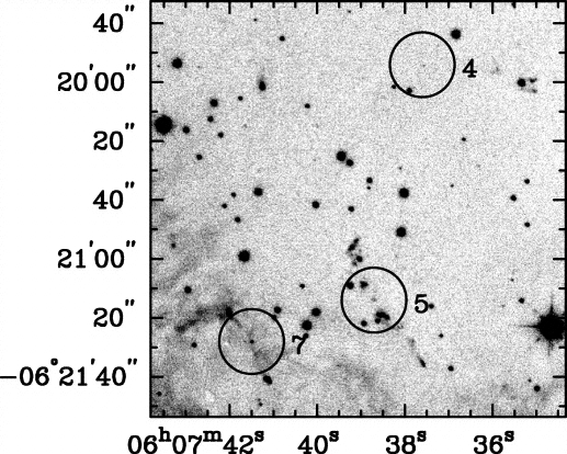 A 2.12 μm S(1) line + continuum image containing three separate systems of H2 knots. HOD07 4 at 6h7m35.3s, −6°20﹩\arcmin﹩0﹩\arcsec﹩ appears as a star with nebulous knots. As shown in Fig. 8, this position is most likely not the central source of this outflow. HOD07 5 at 6h7m38.7s, −6°21﹩\arcmin﹩14﹩\arcsec﹩ is the likely central star of this bipolar jet. HOD07 7 at 6h7m41.5s, −6°21﹩\arcmin﹩28﹩\arcsec﹩ is the likely position of the outflow center of that jet.