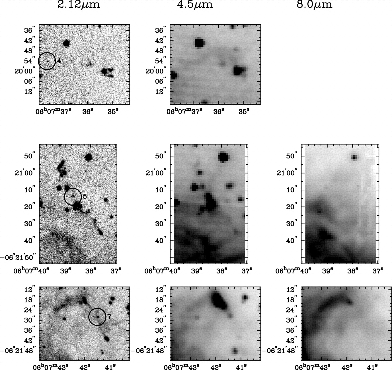 The 2.12 μm S(1), 4.5 μm, and 8.0 μm images of the three systems of H2 knots found in the area of Fig. 7. The driving source of HOD07 4 is probably located at 6h7m37.6s, −6°19﹩\arcmin﹩54﹩\arcsec﹩, marked by a very faint star and the apex of the jetlike nebulosity of the Spitzer 4.5 μm image. HOD07 5 lies at 6h7m38.7s, −6°21﹩\arcmin﹩14﹩\arcsec﹩, identified by a faint source at the approximate center of symmetry of the bipolar jet. HOD07 7 at 6h7m41.5s, −6°21﹩\arcmin﹩28﹩\arcsec﹩ is the likely position of the driving source of a bipolar jet.