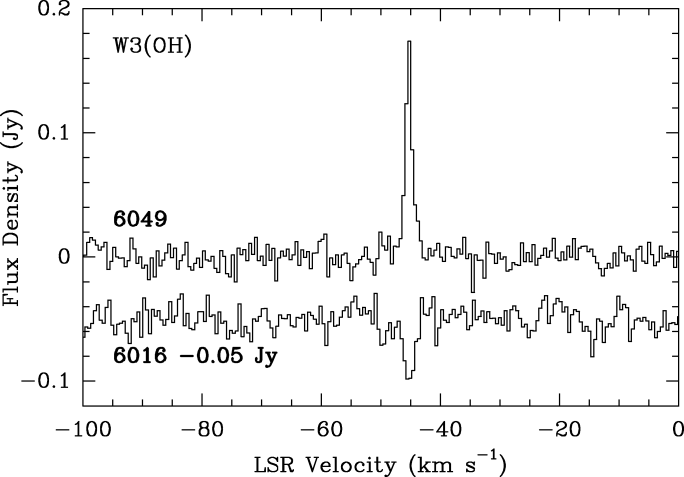 Spectra of the 6016 and 6049 MHz transitions in W3(OH). Emission in the 6049 MHz transition is stronger than absorption in the 6016 MHz transition. A single‐Gaussian fit to the emission is narrower than a similar fit to the absorption.