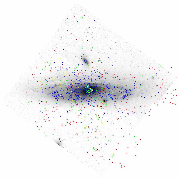 Locations of the spectra taken with Hectospec of M31 cluster candidates. Confirmed clusters, stars, possible stars, and background galaxies are shown in blue, green, yellow, and red, respectively.
