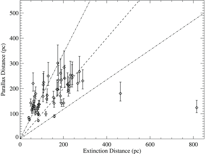 Comparison between KIC "Extinction" distances and Hipparcos "Parallax" distances to stars in the Kepler field, having valid KIC stellar parameters and parallaxes accurate to 20% or better. Error bars correspond to ±1σ uncertainties on the parallaxes. Diagonal lines indicate equality and ±0.23 dex (factor of 1.7).