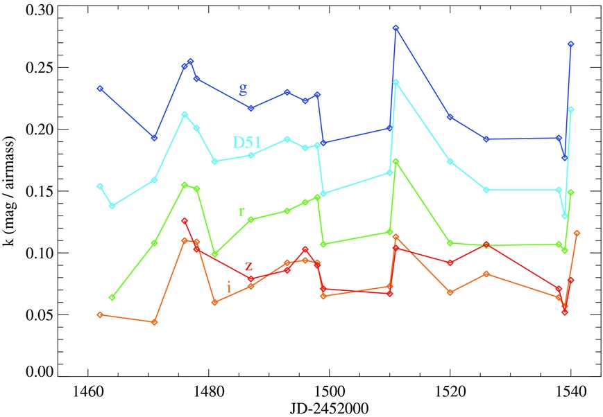 Variation in the k i coefficient (extinction per unit airmass in the ith filter), shown as a function of date, for nights for which reliable linear fits to the extinction could be obtained, during a part of one observing season. The time span shown here was one of the most variable that we encountered in five seasons of observing, but is nonetheless typical in its variability within a factor of 1.5. Filters g, D51, r, i, z are shown in order from top to bottom of the plot. Night-to-night variations tend to be not only correlated, but of similar size among the filters. An exception is the z filter, in which the extinction is evidently affected by a different process than at shorter wavelengths. We believe that this process is extinction from water vapor.