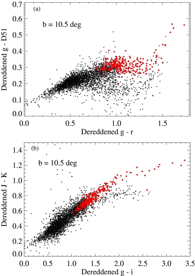 r) color–color diagram for the same 1-deg-square tile as shown in the previous figure, at galactic latitude