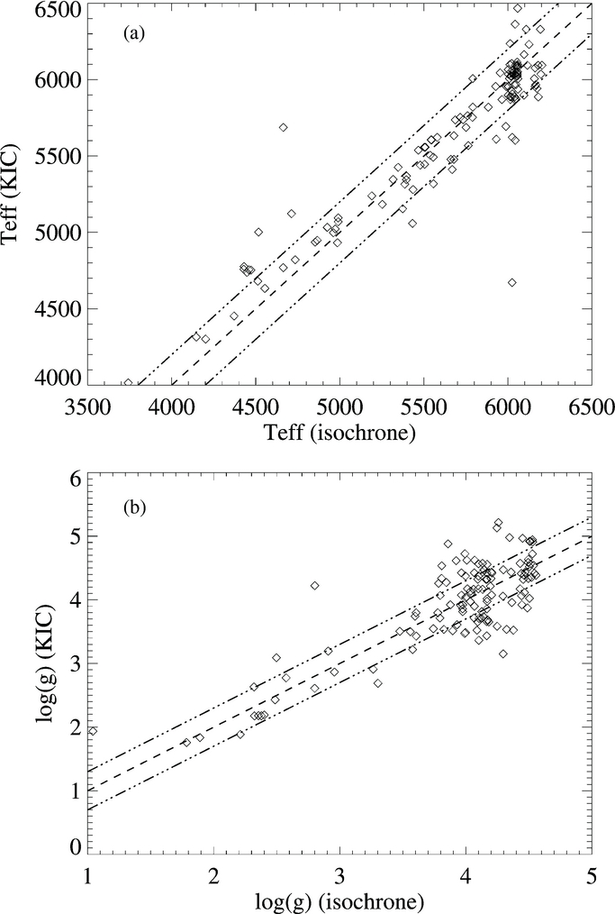 Stellar parameter estimates for confirmed single stars in the star cluster M67. Estimates from the KIC are plotted on the y-axis; along the x-axis are values from the 4 Gyr solar-abundance Yonsei–Yale isochrone (Yi et al. 2008), fit to B, V photometry by Montgomery et al. (1993). The diagonal dashed line indicates equality. Panel (a) shows T eff on each axis, with lines showing equality and ±200 K overplotted. Panel (b) similarly shows log ( g), with lines showing equality and ±0.3 dex.