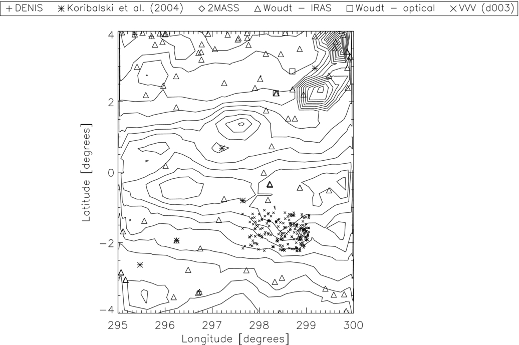 DIRBE/COBE emission map at 2.2 μm; each interval in the contour represents 0.5 MJy; galaxies observed by other surveys (see legend at the top) are large symbols; objects of the present work are represented by crosses in d003 tile centered at (ℓ, b) = (298.3558, −1.6497). References: DENIS (Paturel et al. 2005); 2MASS (Skrutskie et al. 2006); Woudt et al. (2001).