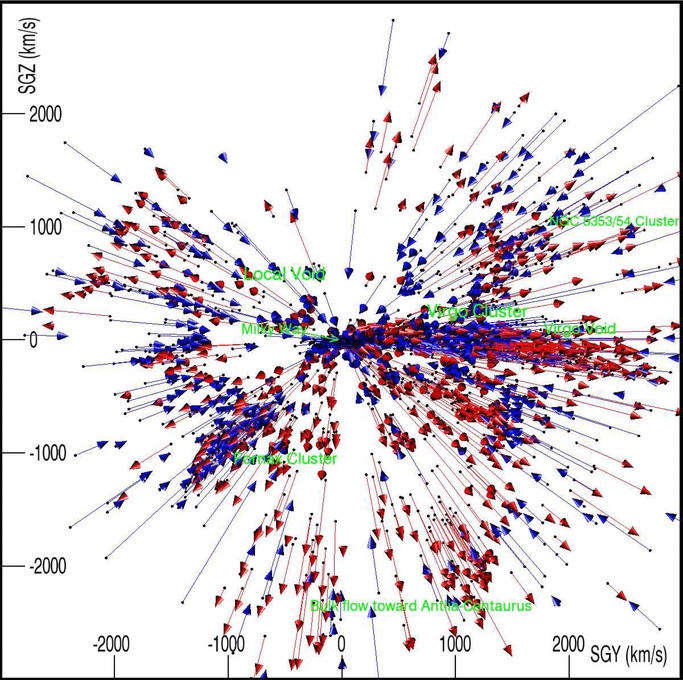 Cosmicflows-1 peculiar radial velocities viewed in the SGY–SGZ plane, the third orthogonal viewing angle. Galaxies with measured distances are shown if located in the slice defined by −1500 km s −1 ⩽ SGX ⩽ 1500 km s −1. Radial peculiar velocity vectors in the CMB frame are again shown with blue for negative velocities and in red for positive velocities.