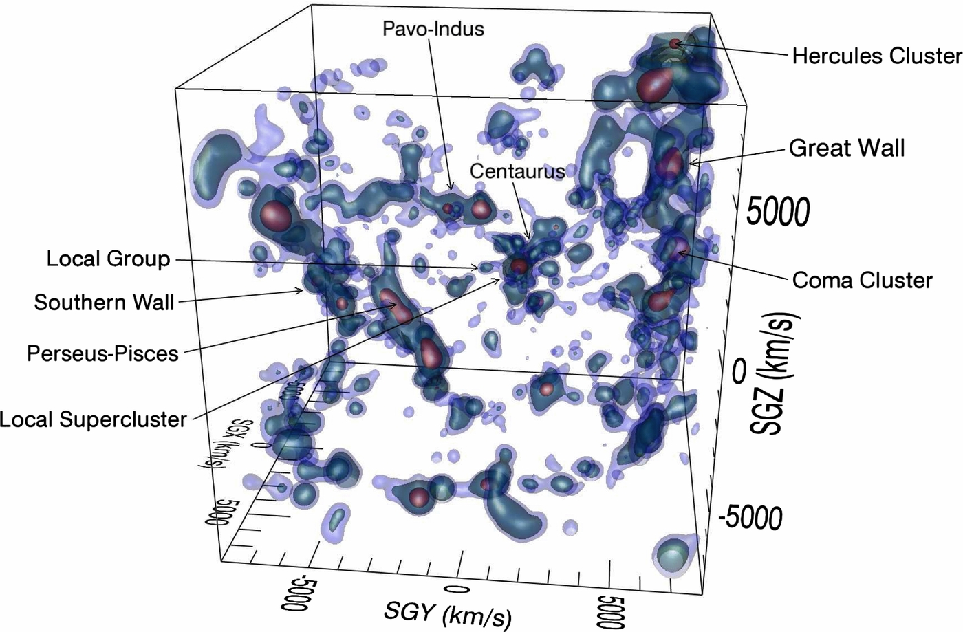 Perspective view of the V8k catalog after correction for incompleteness and represented by three layers of isodensity contours. The region in the vicinity of the Virgo Cluster now appears considerably diminished in importance. The dominant structures are the Great Wall and the Perseus–Pisces chain, with the Pavo–Indus feature of significance.